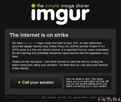 IMGUR - “Imgur stands in solidarity with Reddit, Wikipedia, Google, The White House and countless other groups that oppose HR 3261 (SOPA) and United States Senate Bill S.968 (PIPA). SOPA is not dead; it has been shelved and won’t return “until a consensus is reached,” according to House Majority Leader Eric Cantor (R-VA). The fight against Internet censorship continues as the Senate vote for PIPA is still scheduled for Sunday. It is important that our users understand the far-reaching and potentially disastrous repercussions that this legislation could have on the vibrancy and freedom of the Internet.”